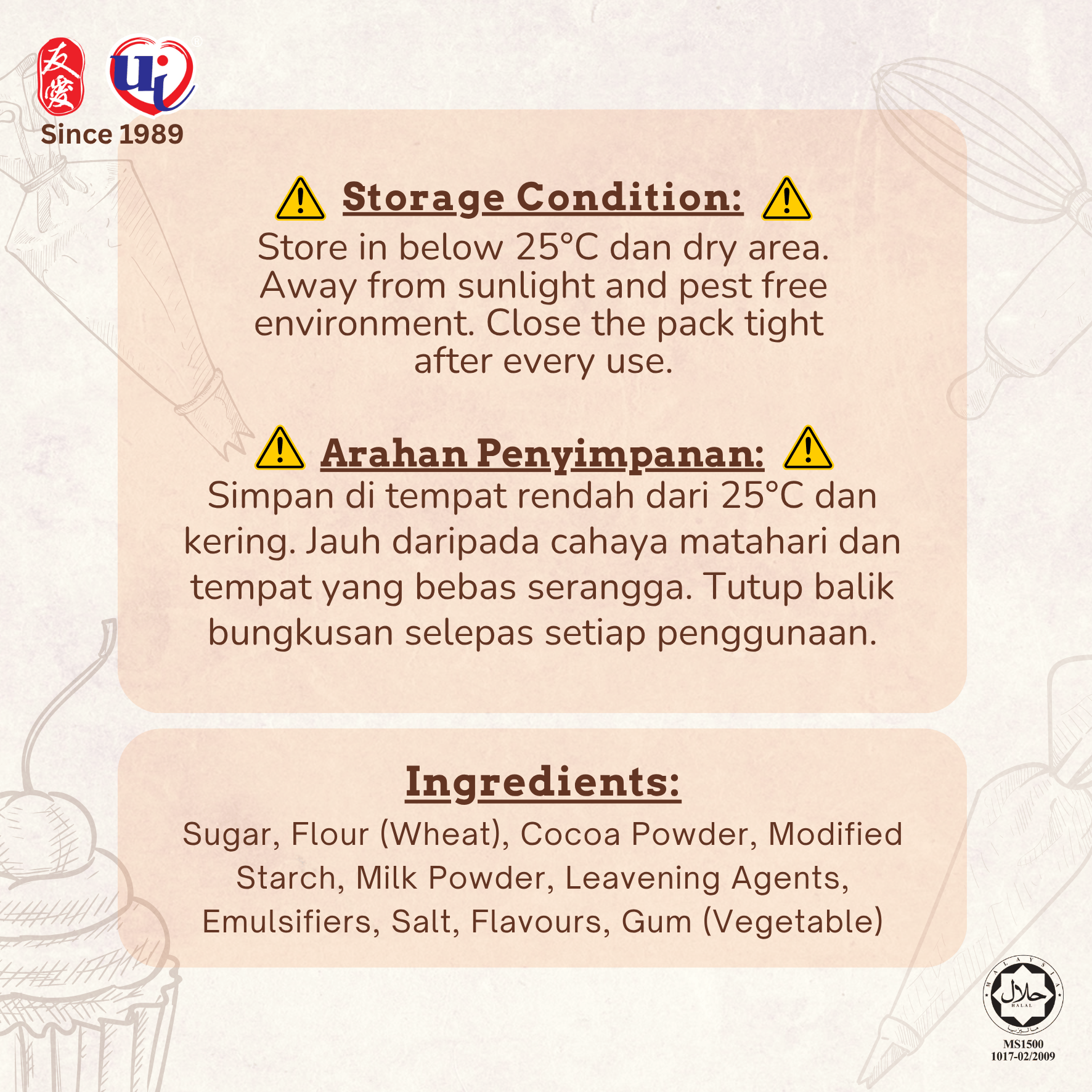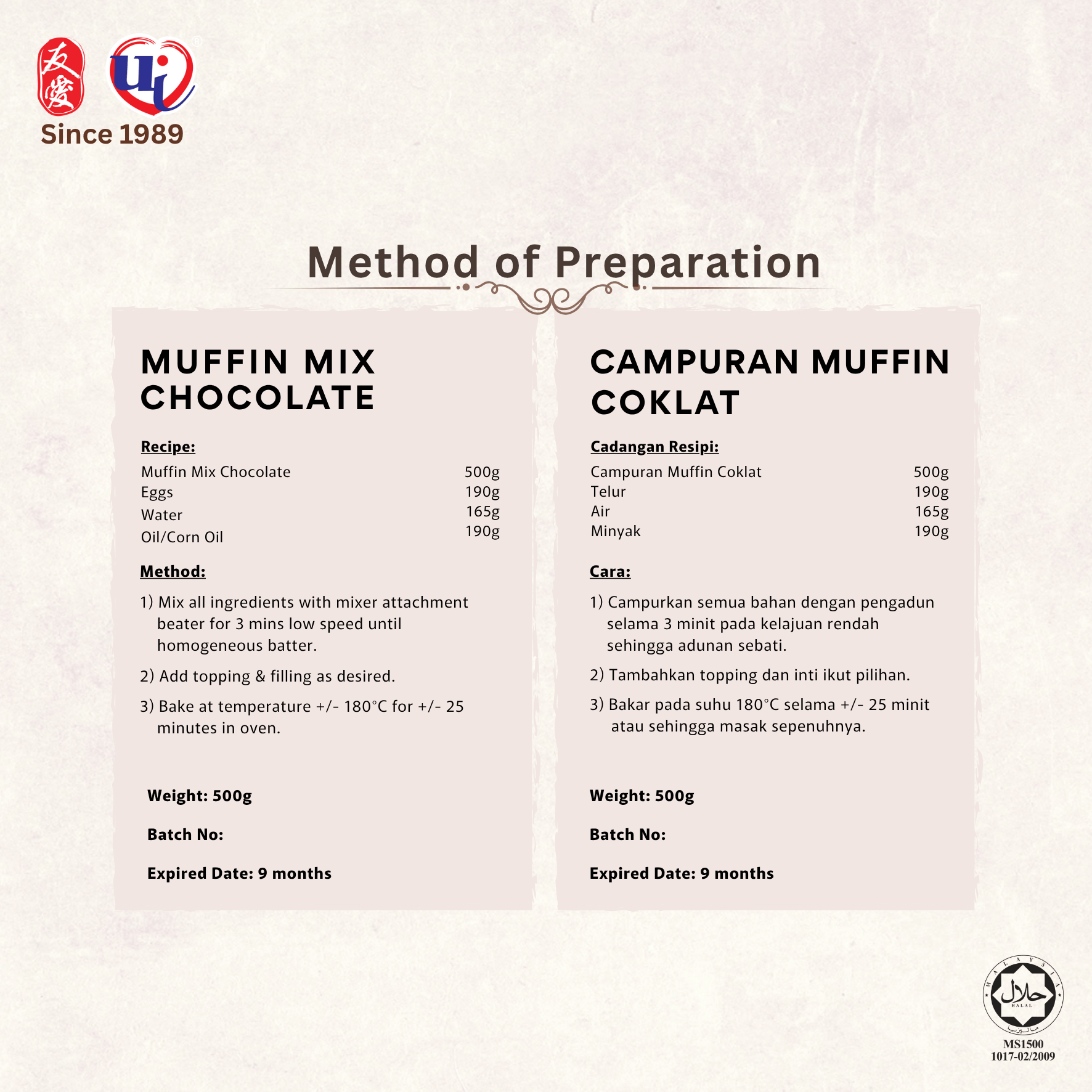 Chocolatey goodness guaranteed when you bake with our Chocolate Muffin Mix. Convenient and hassle-free, you’d find yourself with delicious and moist chocolate muffins when you’re done!
